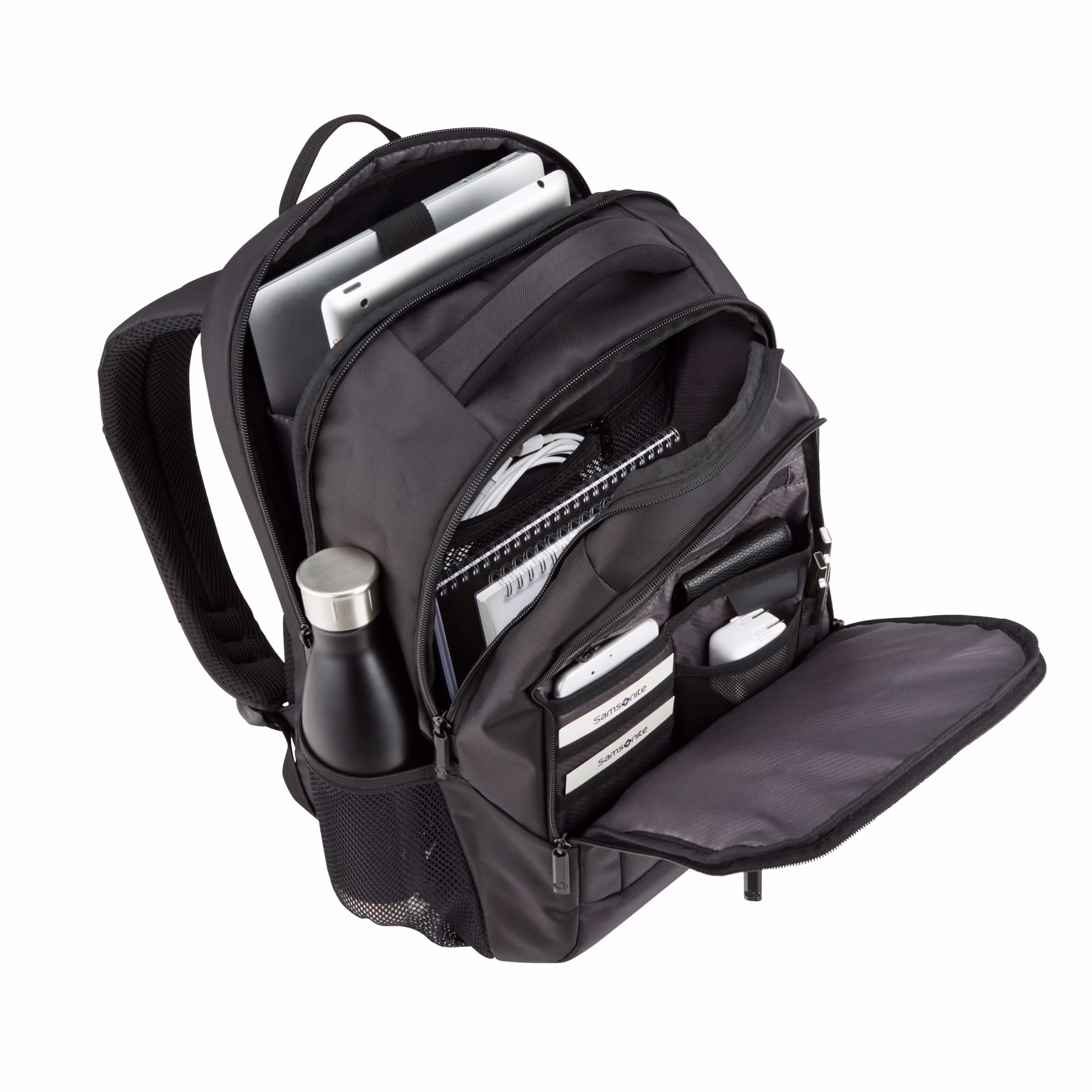 - Large main compartment for storage of cords, files, books, and clothes. Also has a zippered mesh pocket to secure smaller items