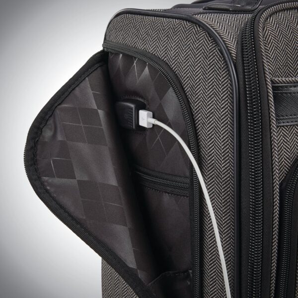 - Exterior: 100% durable polyester herringbone fabric, USB port for convenient charging (battery not included), SmartSleeve™ slides over upright suitcase handle for easy mobility, TSA padlock for added security