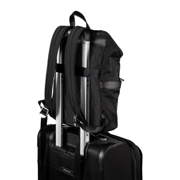 Designed for everyday use as well as business and short travels, this fashion forward carry-on backpack is guaranteed to be a head-turner. Modern and versatile, it offers luxe “Midnight Twill” water-resistant microfiber, a spacious interior—including padded pouches for a laptop and tablet—hide-away carry handles and back straps, plus a handle pass-through sleeve (with a zip- closed bottom that creates an extra pocket) for transporting on top of a suitcase.