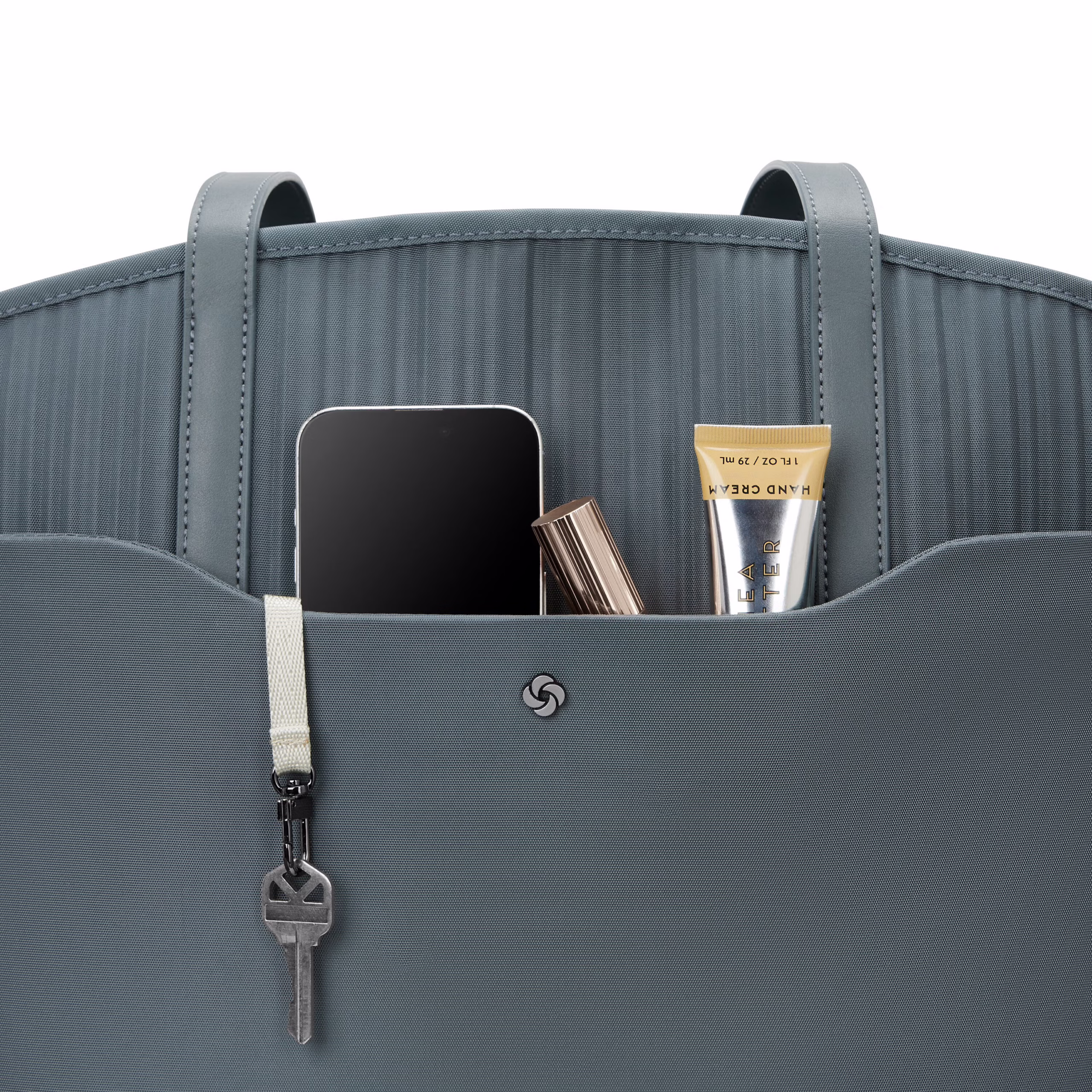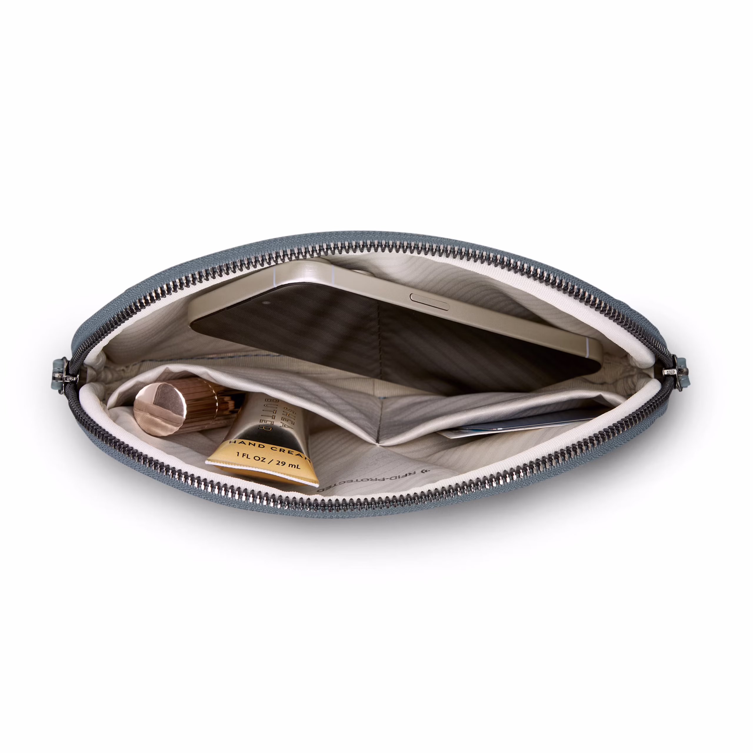 • Removable wristlet that magnetically attaches to the inside of the main compartment