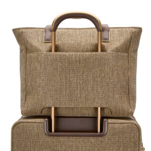 The exterior of the classic Tweed tote melds sophisticated style with contemporary design. Pebbled leather details sit atop the familiar tweed fabric treated with weather and stain resistance. The main compartment features a padded laptop sleeve with a secure zipper closure. A side compartment includes a removable RFID wristlet to keep your keys, credit cards, and phone secure, safe, and easily accessible. For a touch of added luxury, the hardware has been upgraded with a bespoke matte brass finish.