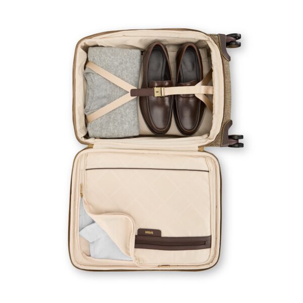 Our domestic carry-on melds newly added double leather signature details are set atop the distinctive tweed fabric treated with weather and stain resistance. A 12-position contoured pull handle makes it possible to glide through confined spaces effortlessly. And integrated TSA locks are a welcomed addition to a seamless journey.