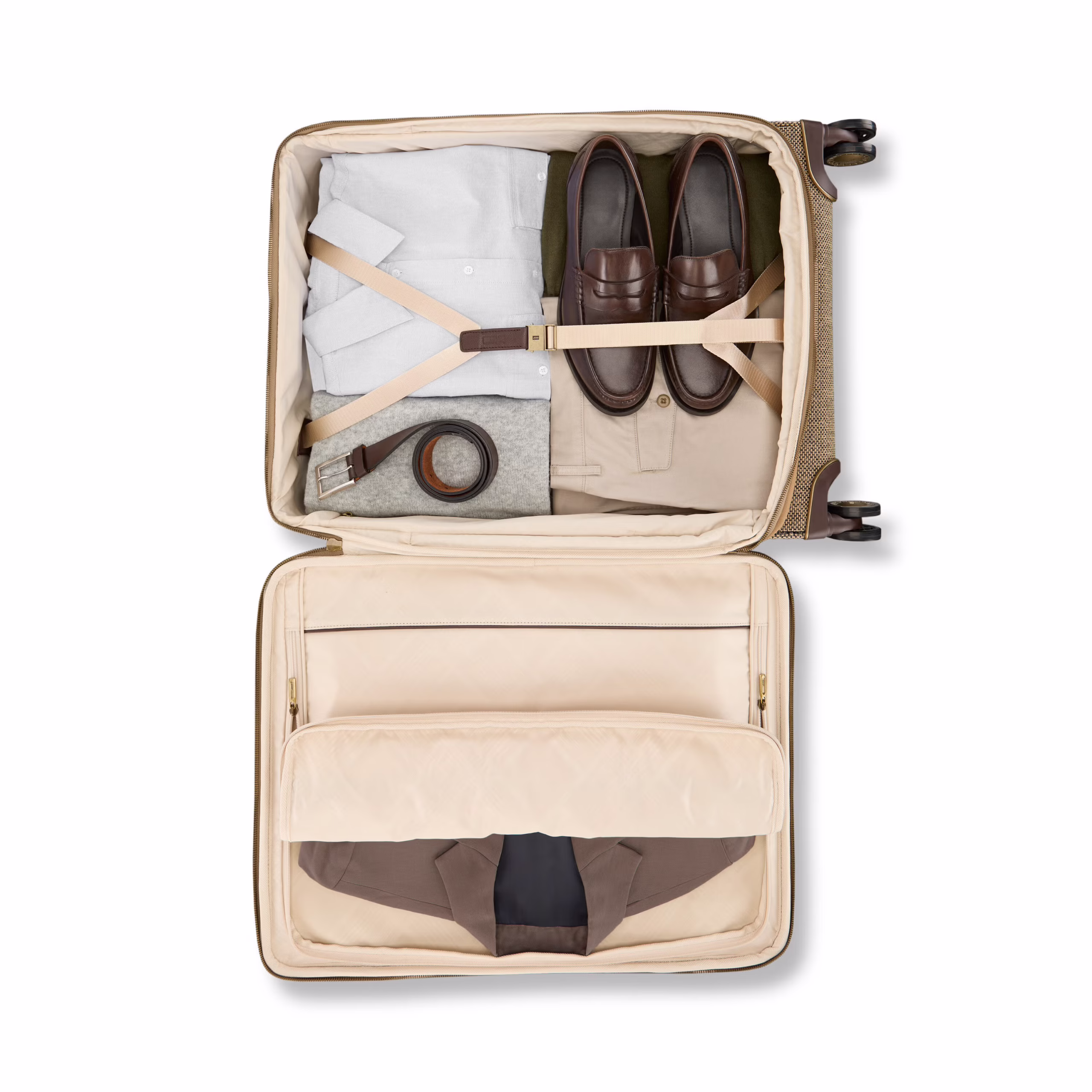 Our medium journey melds newly added double leather signature details are set atop the distinctive tweed fabric treated with weather and stain resistance. Pebbled leather handles with heritage Hartmann insignia and bespoke matte brass finish hardware offer the uncompromising quality and detail you expect. Revolutionary hardened steel cartridge ball bearing wheel design ensures the ultimate maneuverability. And integrated TSA locks are a welcomed addition to a seamless journey.