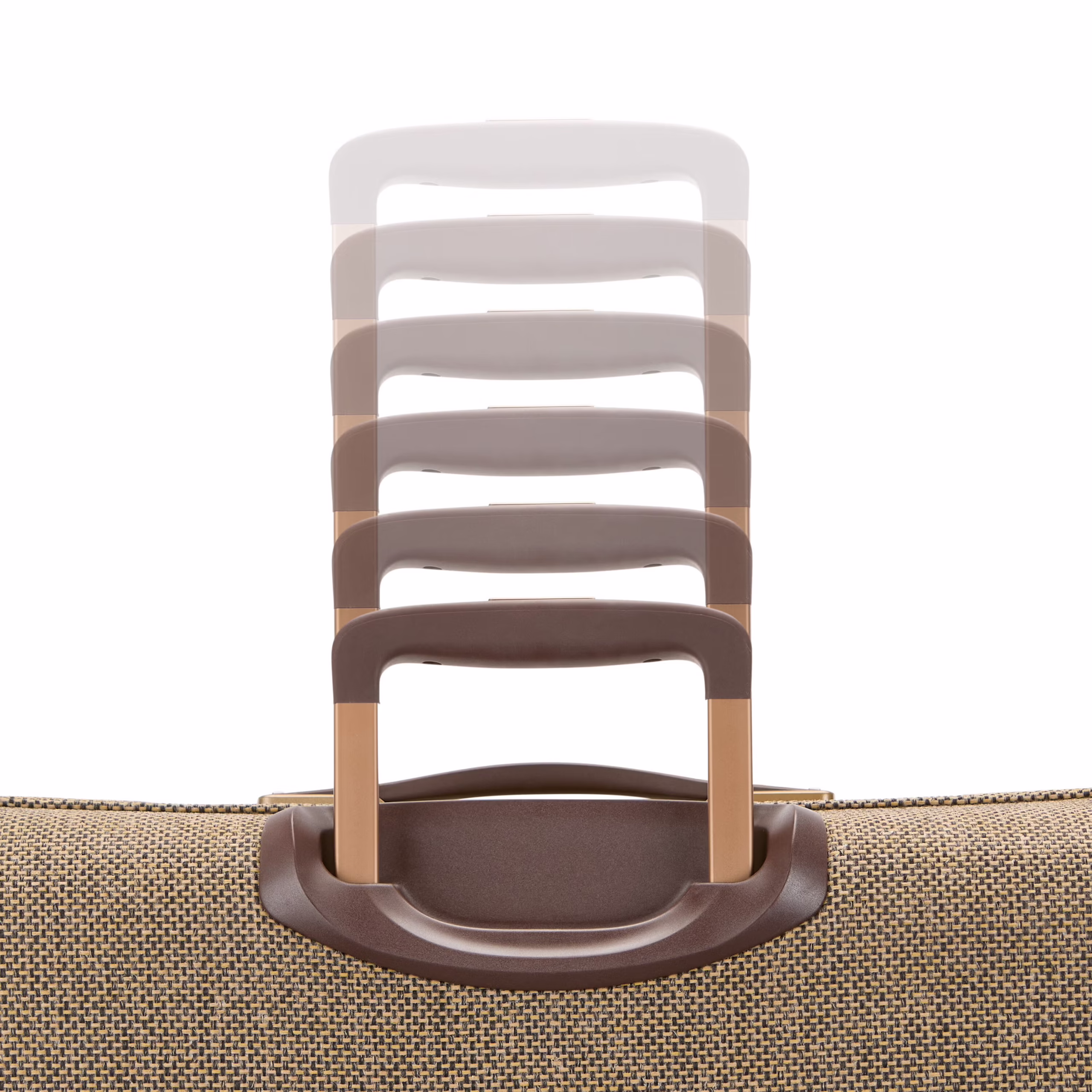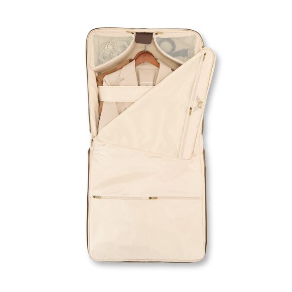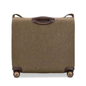 This garment bag melds newly added double leather signature details atop the familiar tweed fabric treated with weather and stain resistance. A pebbled leather handle and bespoke matte brass finish hardware offers the uncompromising quality you expect. Revolutionary hardened steel cartridge ball bearing wheel design ensures the ultimate maneuverability. On the inside, dual hanging brackets for easy closet-to-bag transition and a padded extension panel ensure a wrinkle-free attire for formal occasions.