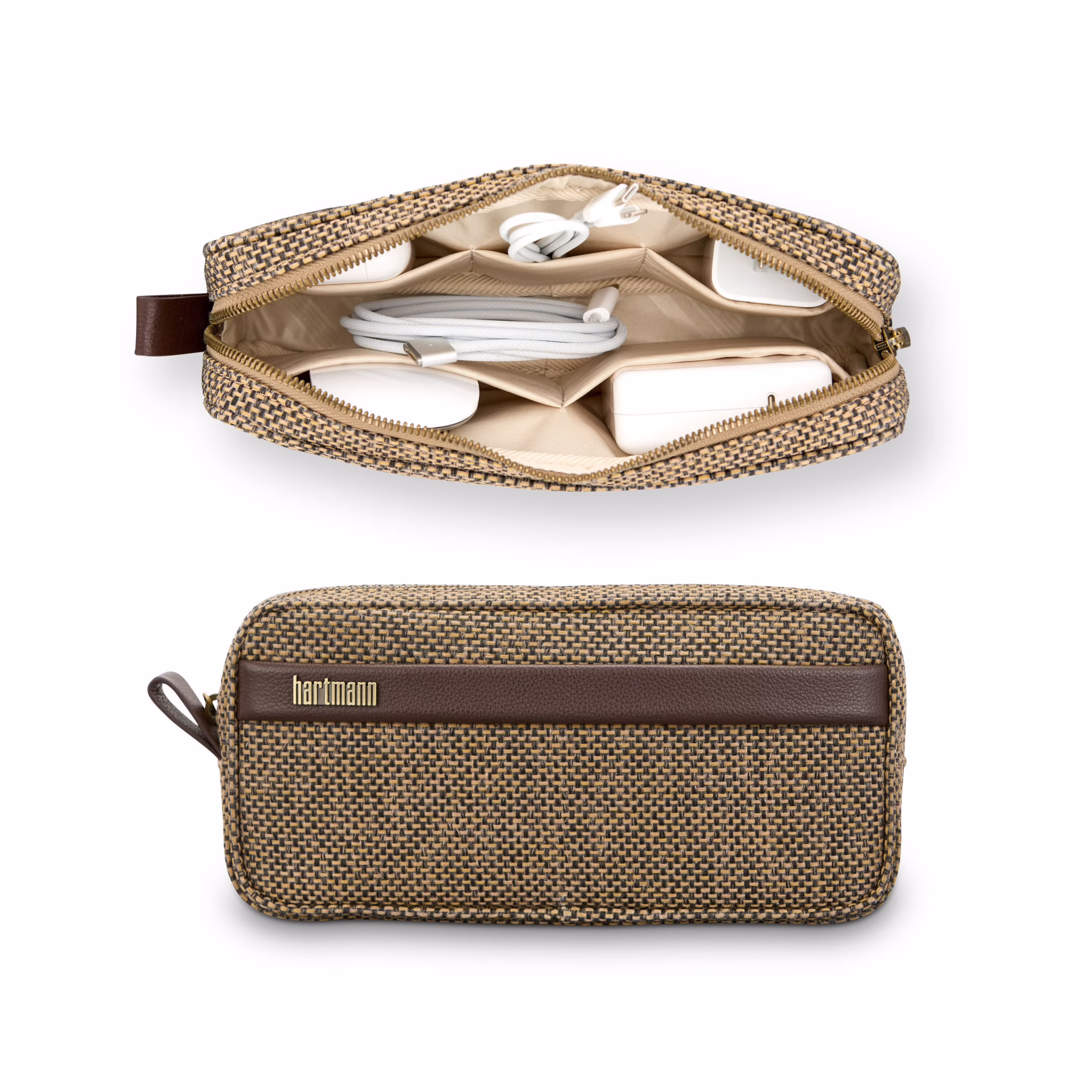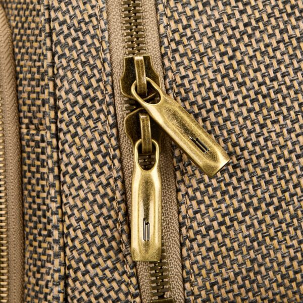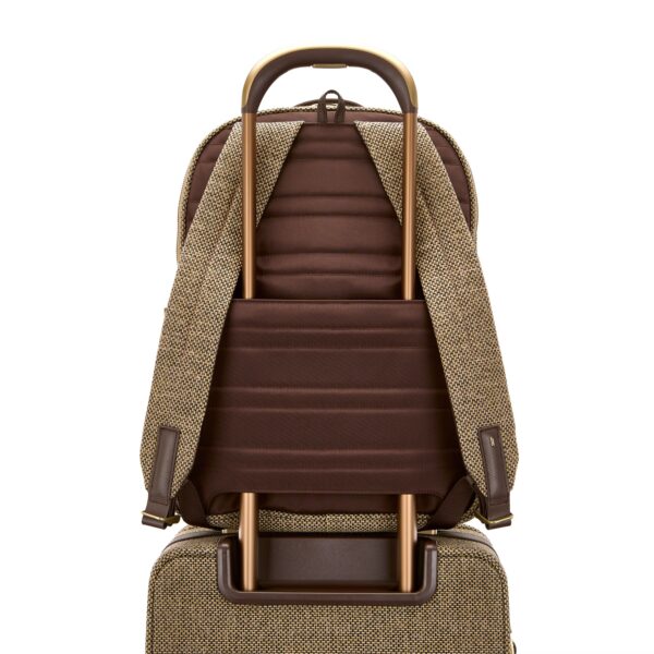 The Tweed backpack melds double leather signature details atop classic tweed fabric treated with weather and stain resistance. The main interior compartment features a removable TecKit for tech cables and other essentials, a separate laptop and tablet compartment with 360° padding for complete protection, and a secure metal zipper. The front RFID zippered compartment will keep your phone, key fob, and credit cards secure, safe, and easily accessible. And for a polished look, all hardware features a matte brass finish.